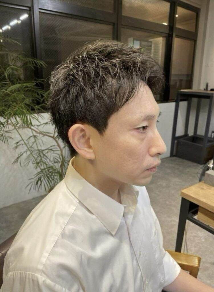 ・サイド短め ・トップの中央に高さがある ・顔まわりが引き締まる ※営業職やアクティブな職種に人気。